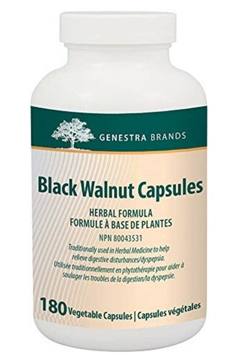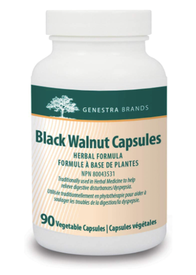 Les capsules de noyer noir sont un mélange de plantes traditionnellement utilisées en phytothérapie pour soulager les troubles digestifs. Le noyer noir, le quassia, l'absinthe et la racine de gentiane contiennent tous des composés extrêmement amers, notamment des tanins, de la quassine, de l'absinthine et de l'amarogentine. 1-4 Ces amers stimulent les nerfs des papilles gustatives, augmentant ainsi la sécrétion de salive et de sucs gastriques, facilitant ainsi la digestion. 4 Les amers peuvent également se lier aux récepteurs des cellules endocrines du tractus gastro-intestinal et du pancréas, ce qui entraîne la sécrétion de cholécystokinine, une hormone peptidique. 5 Cela libère à son tour des sels biliaires et des enzymes digestives pancréatiques, augmentant ainsi la motilité gastrique. 5 La racine de gentiane et le quassia peuvent contribuer à soulager la dyspepsie en augmentant la cytoprotection médiée par les prostaglandines dans la membrane gastrique ; les prostaglandines stimulent la libération de mucus et de bicarbonate de sodium dans l'estomac. 2,6,7 Les graines de Quassia, de noyer noir et de citrouille sont également traditionnellement utilisées en phytothérapie comme vermifuge (aide à l'expulsion des vers parasites).