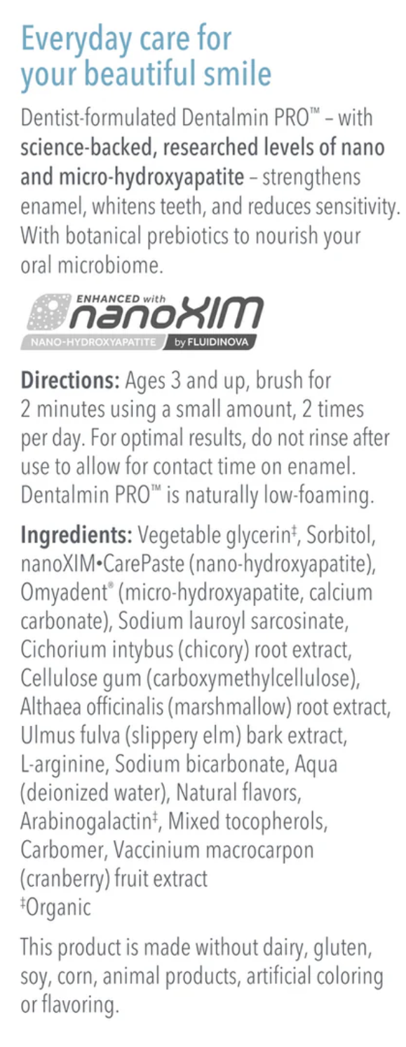 Dentalmin PRO™ includes not just one but two patented forms of hydroxyapatite (nano and micro) at researched concentrations. That means comprehensive repair and strengthening activity. Because we prioritize safety and efficacy, we chose naturally occurring Omyadent® 100 and NanoXIM•CarePaste, the only nano-hydroxyapatite approved as safe by the European-based Scientific Committee on Consumer Safety (SCCS).