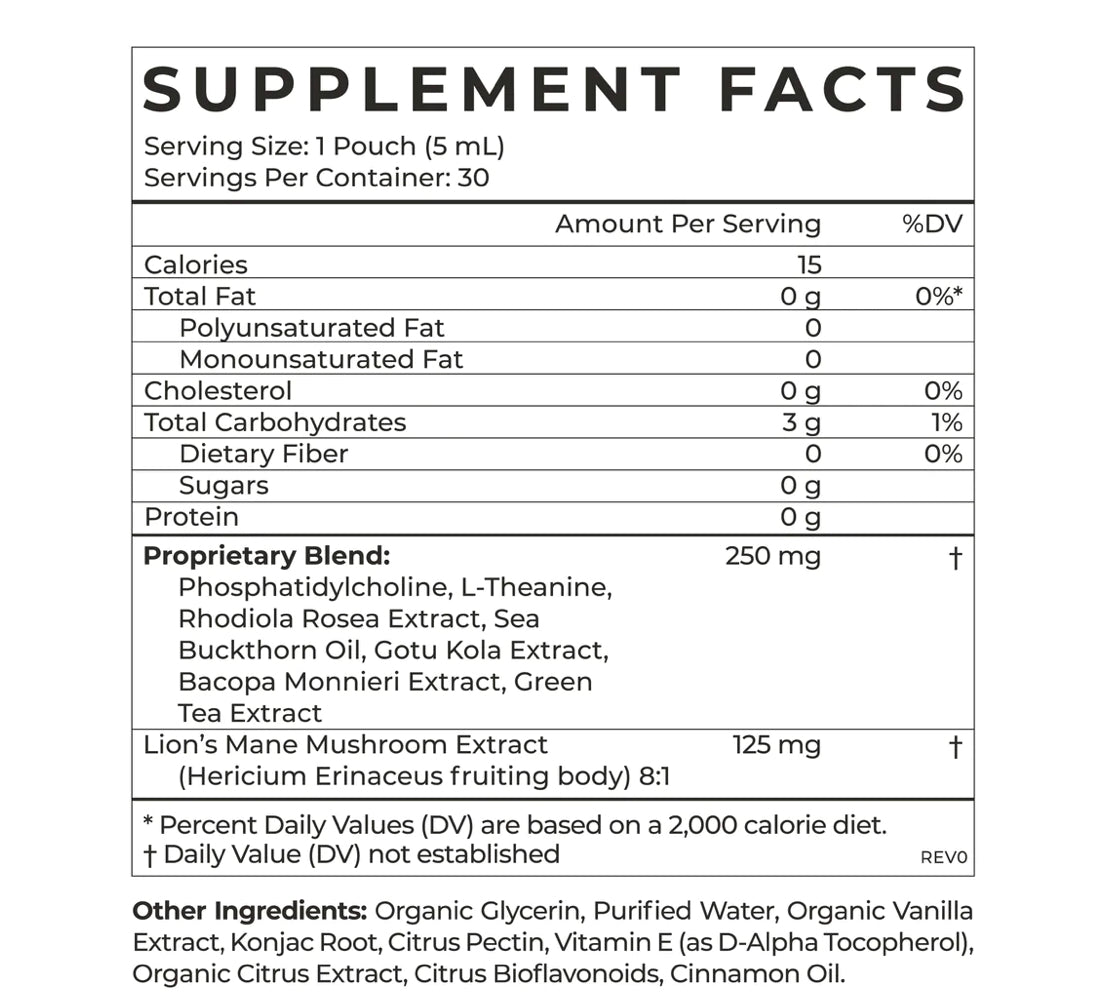 Phosphatidylcholine, L-théanine, extrait de Rhodiola rosea, huile d'argousier, extrait de Gotu Kola, extrait de Bacopa Monnieri, extrait de thé vert, extrait de champignon crinière de lion (corps fructifère d'Hericium Erinaceus) 8:1