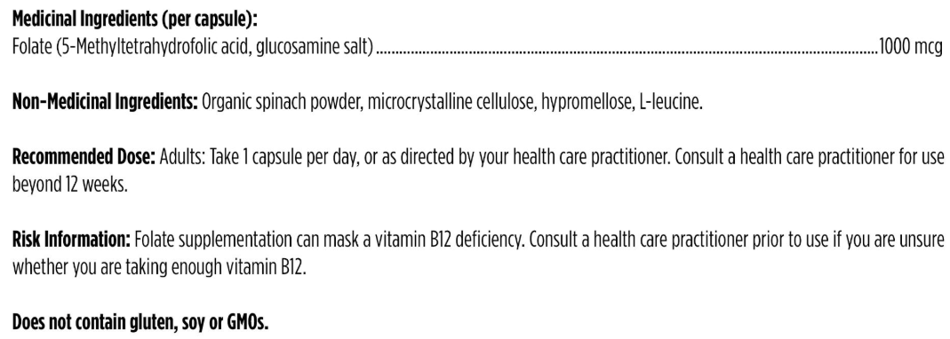 Folate (vitamin B9) is provided in its biologically active form, L-5-MTHF, which supports normal methylation. Features Quatrefolic® for high bioavailability.