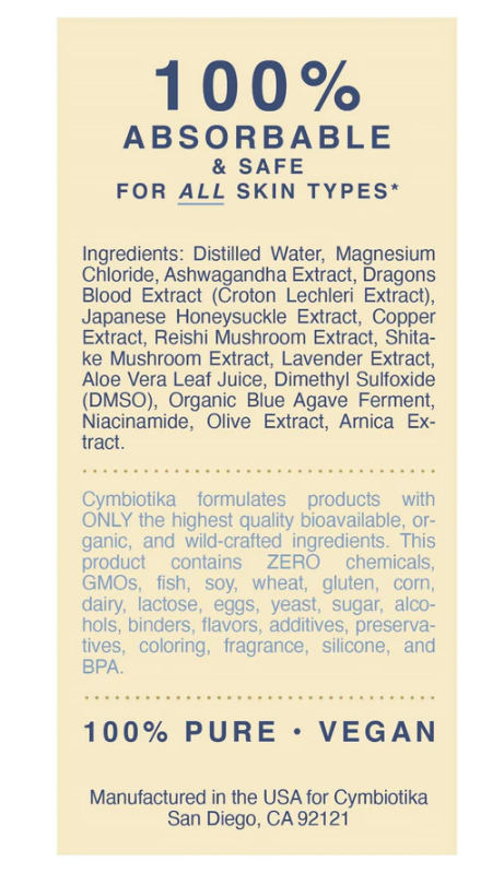 Ingrédients : Chlorure de magnésium, extrait d'ashwagandha, extrait de sang de dragon, extrait de chèvrefeuille japonais, extrait de lavande, extrait de cuivre, complexe de champignons shiitake/reishi, extrait de feuille d'aloe vera, diméthylsulfoxyde DMSO, ferment d'agave bleu biologique, niacinamide, extrait d'olive, extrait d'arnica