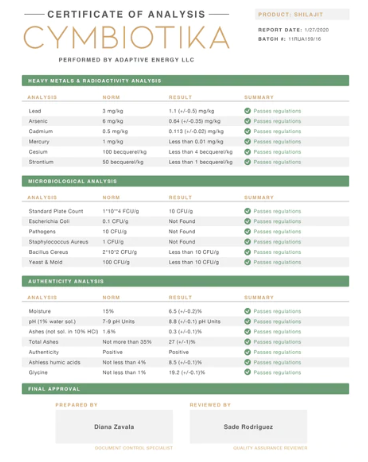 La résine vivante Shilajit Black Gold® de Cymbiotika est un nutriment minéral complexe, issu de régions préservées de haute altitude. Contenant plus de 84 minéraux, notre résine Shilajit pure est riche en acide fulvique, acide humique, vitamines, enzymes, tocophérols, bioflavonoïdes, antioxydants et métabolites bénéfiques pour l'organisme. C'est l'adaptogène le plus puissant du marché et sa teneur en or est la plus élevée au monde.