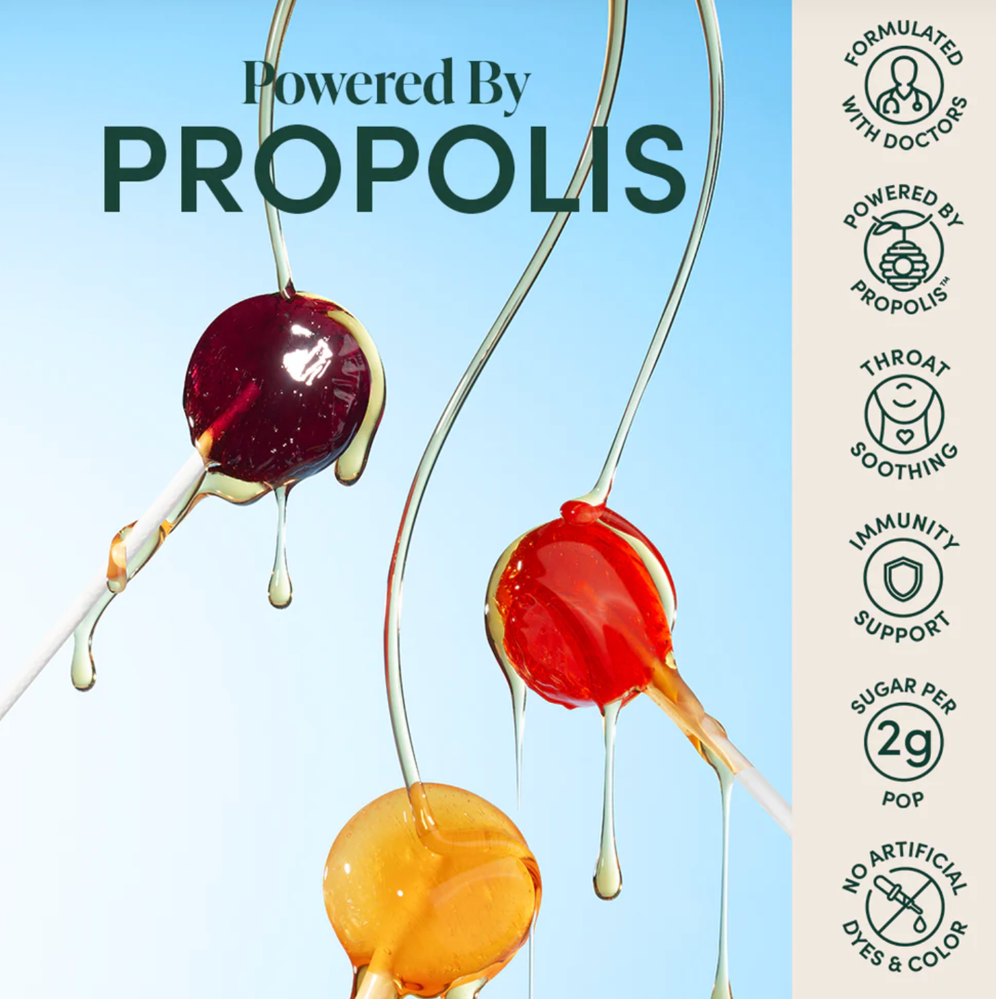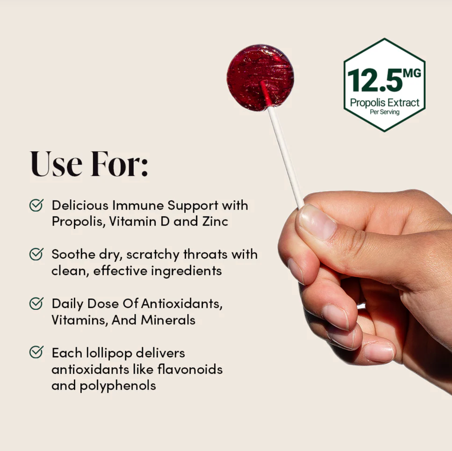 We’ve combined the immune-supporting power of propolis, vitamin D, and zinc into a delicious lollipop with only 2g of sugar and no artificial dyes or flavors. Includes 3 flavors: strawberry, green apple, and mixed berry with elderberry.