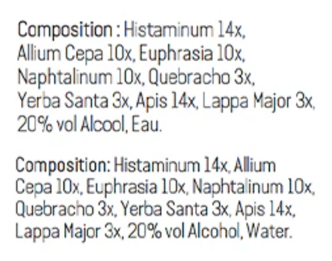 Composition: Histaminum 14x, Allium Cepa 10x, Euphrasia 10x, Naphtalinum 10x, Quebracho 3x, Yerba Santa 3x, Apis 14x, Lappa Major 3x, 20% vol Alcohol, Water USP.