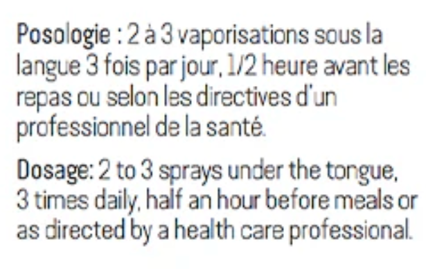 Dosage: 2 to 3 sprays under the tongue, 3 times daily, half an hour before meals or as directed by a health care professional.