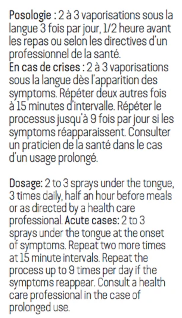 Acute cases: 2 to 3 sprays under the tongue at the onset of symptoms. Repeat two more times at 15 minute intervals. Repeat the process up to 9 times per day if the symptoms reappear. Consult a health care professional in the case of prolonged use.