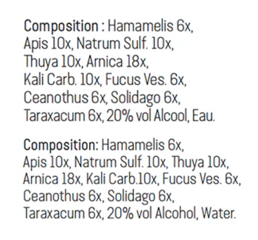 Composition: Hamamelis 6x, Apis 10x, Natrum Sulf. 10x, Thuya 10x, Arnica 18x, Kali Carb.10x, Fucus Ves. 6x, Ceanothus 6x, Solidago 6x, Taraxacum 6x, 20% vol Alcohol, Water USP.