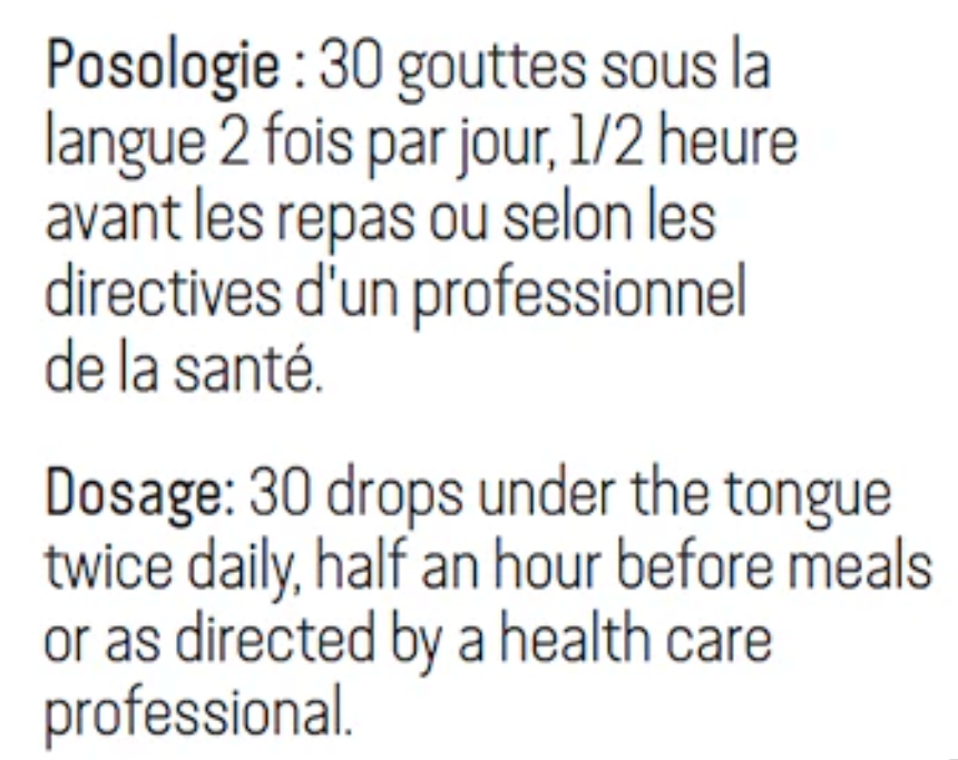 Dosage: 30 drops under the tongue 2 times daily, half an hour before meals or as directed by a health care professional.