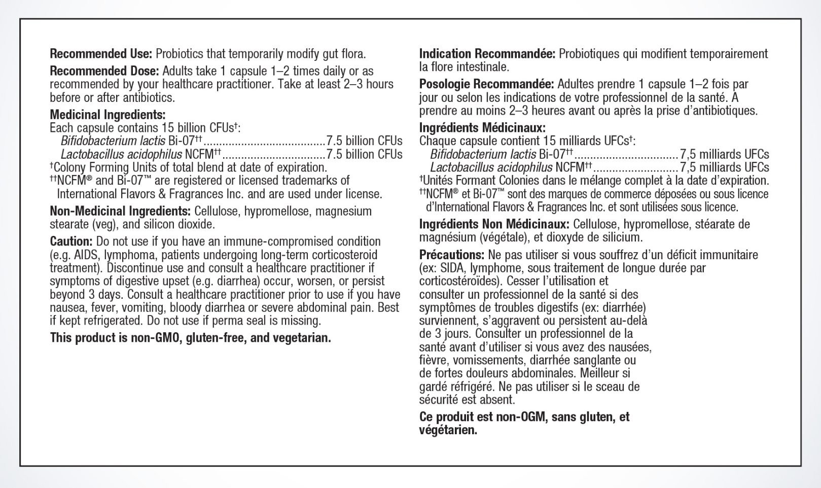 Caution: Do not use if you have an immune-compromised condition (e.g. AIDS, lymphoma, patients undergoing long-term corticosteroid treatment). Discontinue use and consult a healthcare practitioner if symptoms of digestive upset (e.g. diarrhea) occur, worsen, or persist beyond 3 days. Consult a healthcare practitioner prior to use if you have nausea, fever, vomiting, bloody diarrhea or severe abdominal pain. Best if kept refrigerated. Do not use if perma seal is missing.