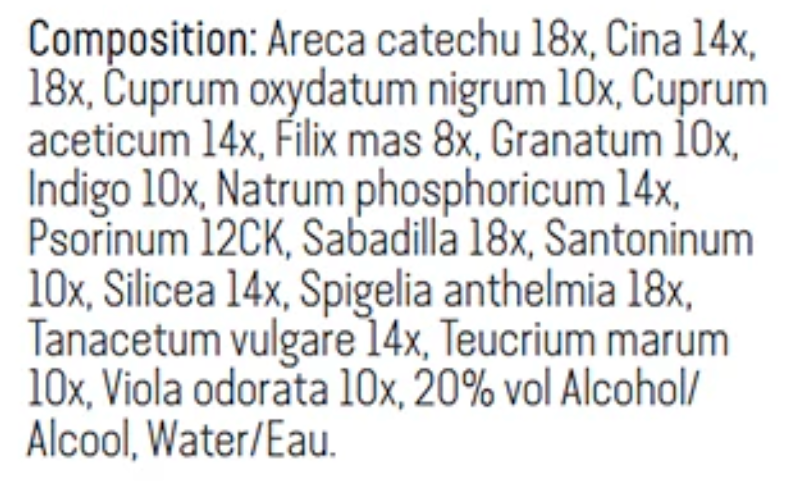 Composition: Areca catechu 18x, Cina 14x, 18x, Cuprum oxydatum nigrum 10x, Cuprum aceticum 14x, Filix mas 8x, Granatum 10x, Indigo 10x, Natrum phosphoricum 14x, Psorinum 12CK, Sabadilla 18x, Santoninum 10x, Silicea 14x, Spigelia anthelmia 18x, Tanacetum vulgare 14x, Teucrium marum 10x, Viola odorata 10x, 20% vol Alcohol, Water USP