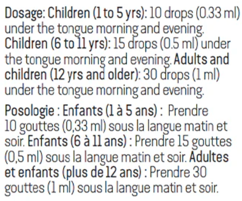 Children (1 to 5 yrs): 10 drops under the tongue morning and evening, then swallow.